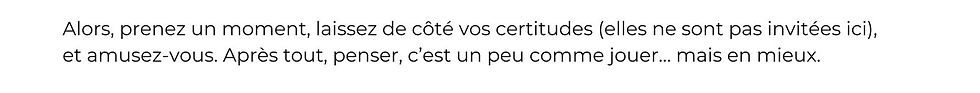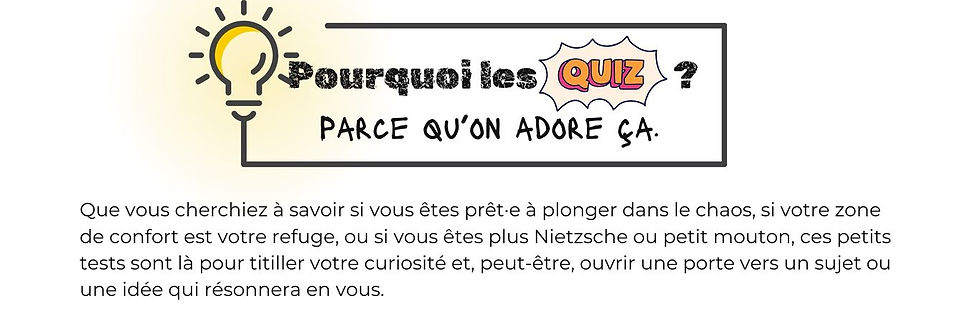 Ce que vous allez trouver ici, ce sont des quiz introspectifs un peu décalés, faits avec passion, humour et une bonne dose d'audace. Ces petits tests vous invitent à explorer vos idées, à réfléchir à votre zone de confort, et à titiller votre curiosité.